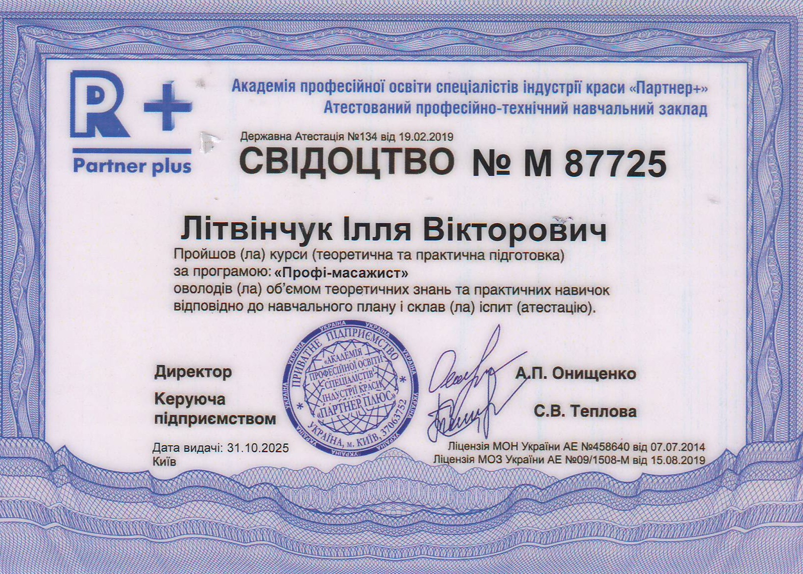 Дякую за професійну роботу реабілітолога-масажиста Літвінчука Іллі Вікторовича. Справжній майстер своєї справи. Відповідальний, чуйний, розуміючий.